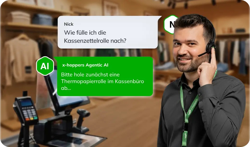 Anstatt mit mehreren Geräten und Anmeldungen zu jonglieren, bietet x-hoppers Ihren Mitarbeitern eine einfache, sprachgesteuerte Schnittstelle, die sie mit der gesamten Filiale verbindet. Sie tragen lediglich ein Headset oder öffnen die mobile App und erhalten sofort Zugriff auf KI-Assistenz, Echtzeit-Benachrichtigungen und eine direkte Verbindung zu Kollegen im gesamten Unternehmen – alles über ein einziges, benutzerfreundliches Tool.