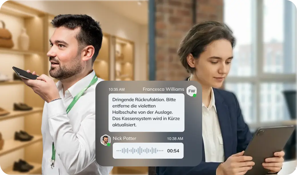 Geben Sie Ihren Filialmitarbeitern das Selbstvertrauen, auf Kunden zuzugehen, indem Sie ihnen uneingeschränkten Zugang zu ihren Kollegen und einem KI-Assistenten bieten, um im Verkaufsraum direkt auf Fragen zu antworten.