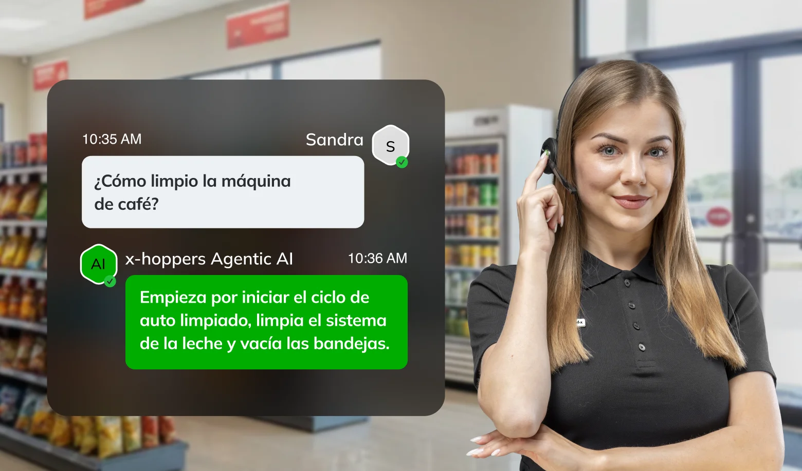 En las tiendas de barrio, las preguntas no pueden esperar. Llegan en el momento de mayor afluencia, alejando a tus trabajadores de los clientes. Con nuestro asistente de IA, los trabajadores pueden obtener respuestas claras y rápidas a través de sus auriculares en cualquier momento y en cualquier parte, sin necesidad de alejarse del cliente.