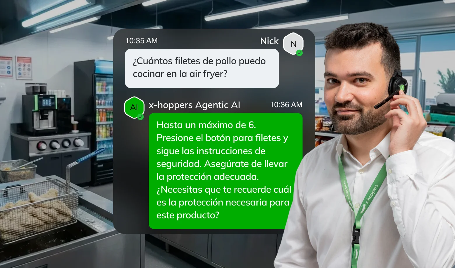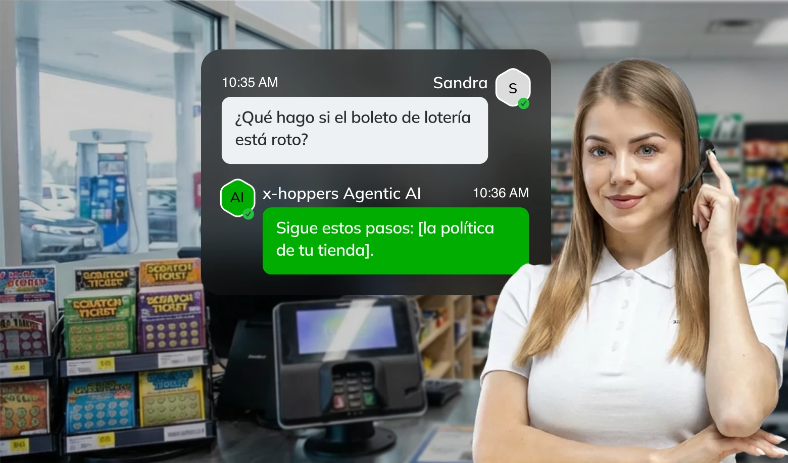 Desde gestionar pagos de lotería hasta arreglar errores del surtidor, nuestro asistente por IA dirige todas sus respuestas directamente en los oídos de tus trabajadores, asegurando que los procedimientos se siguen de forma correcta y consistente.