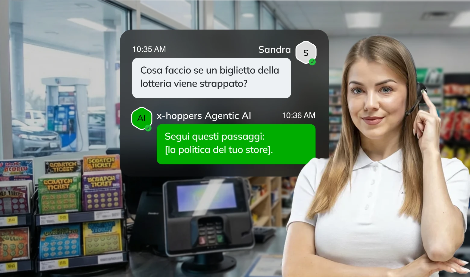 Dalla gestione di un pagamento della lotteria alla risoluzione di un errore della pompa del carburante, il nostro assistente AI fornisce la risposta a ogni domanda direttamente all’orecchio dei tuoi collaboratori, garantendo che le procedure vengano seguite correttamente e in modo coerente.